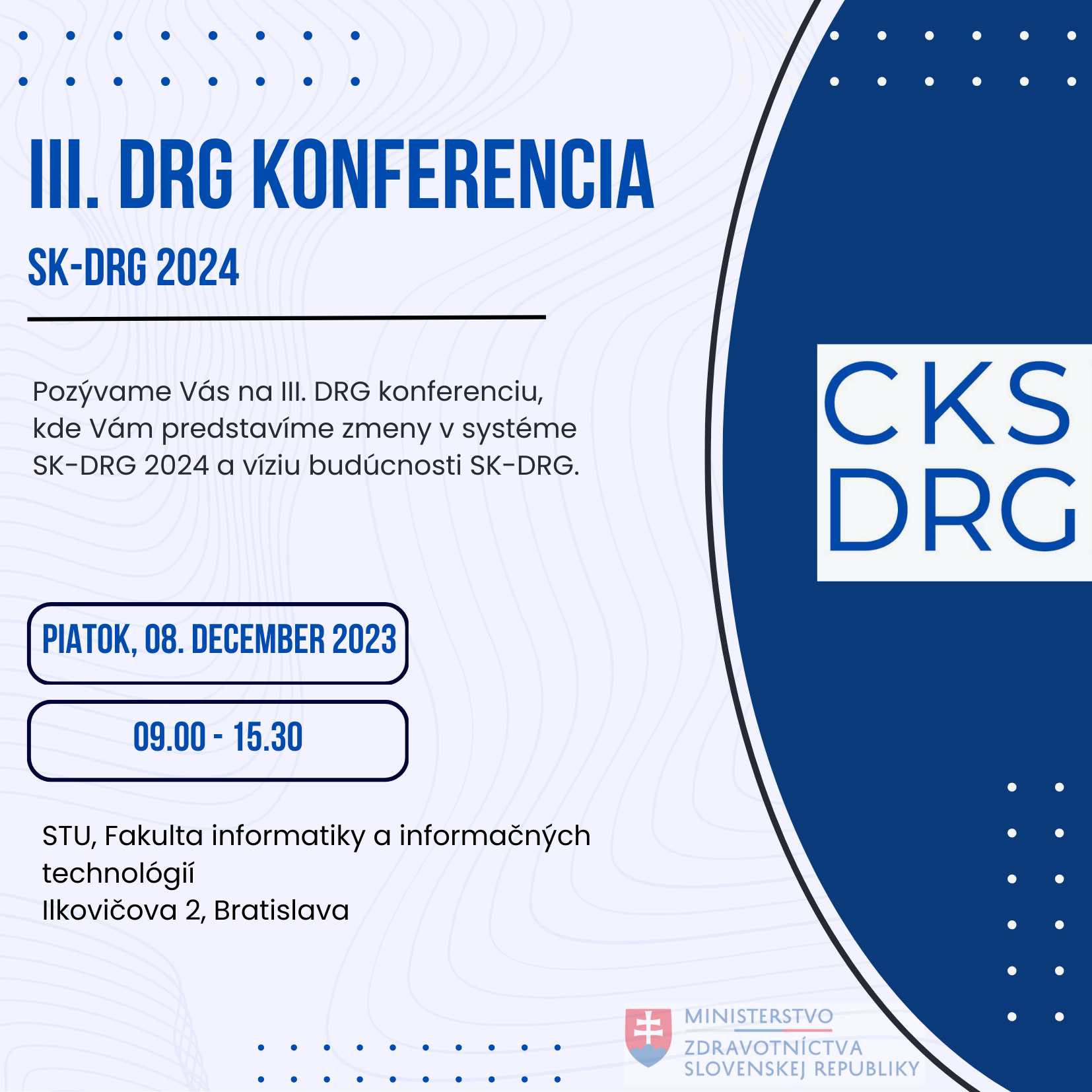 We would like to inform you that the Centre for DRG Classification System under the auspices of the Ministry of Health of the Slovak Republic is organizing the III. DRG Conference SK-DRG 2024, which will take place on 8.12.2023 in the premises of the Faculty of Informatics and Information Technologies of the Slovak University of Technology at Ilkovičova 2 in Bratislava.